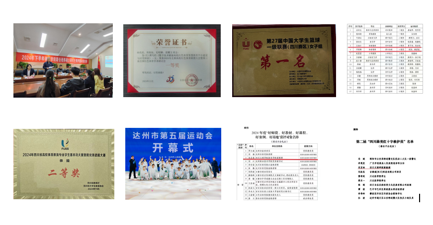 体育学院党委坚持以党建引领学院的高质量发展,在学科建设、人才培养、服务地方等方面取得了一定的成绩:研究生联合培养工作持续开展已三年,累计培养12名研究生,其中一名联合培养的研究生获四川省高校体育科学论文报告会一等奖。学院申报并立项红色体育研究课题2项,荣获全国红色体育学术研讨会一等奖1项。体育学院女篮在第27届中国大学生篮球一级联赛(四川赛区)女子组获得第一名。学院有2名选手在川渝第三届师范生教学能力大赛中初中组和高中组中均获得第三名的好成绩。体育教育专业学生在2024年四川省高校体育教育专业学生基本功大赛中获得教学技能三等奖,体操二等奖,田径三等奖。先后在“划遍四川”龙舟赛达州站和达州市第五届运动会的开幕式展示了文理学子的风采。宋京林老师被达州市委组织部授予“达州市2024年度党性教育类好师资”的称号,并获得“最美救护员”称号。